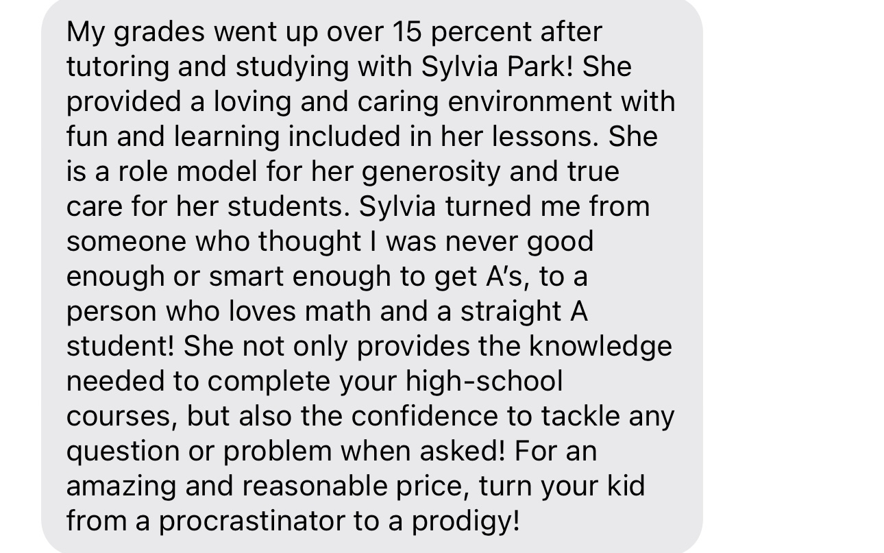 “My grades went up over 15 percent after tutoring and studying with Sylvia Park. She provided a loving and caring environment with fun and learning included in her lessons. She is a role model for her generosity and true care for her students. Sylvia turned me from someone who thought I was never good enough or smart enough to get A’s, to a person who loves math and a straight A student. She not only provides the knowledge needed to complete your highschool courses, but also the confidence to tackle any question or problem when asked. For an amazing and reasonable price, turn your kid from a procrastinator to a prodigy”